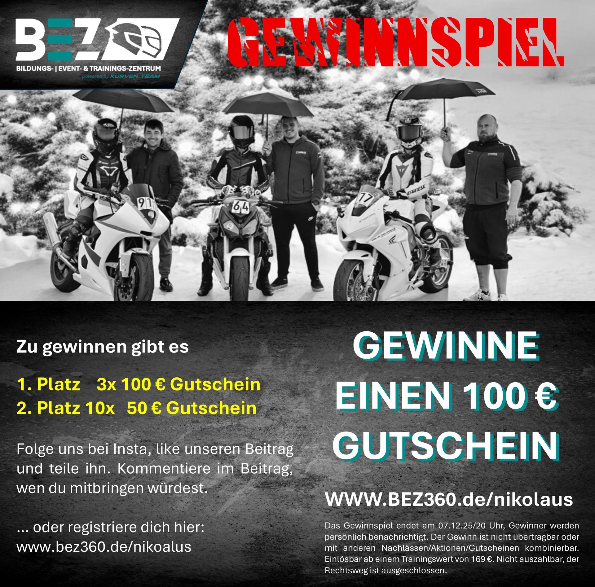 Das Gewinnspiel endet am 07.12.25/20:00 Uhr. Gewinner werden persönlich benachrichtigt. Der Gewinn ist nicht übertragbar oder mit anderen Nachlässen/Aktionen/Gutscheinen kombinierbar. Einlösbar ab einem Trainingswert von 169 €. Nicht auszahlbar, der Rechtsweg ist ausgeschlossen.